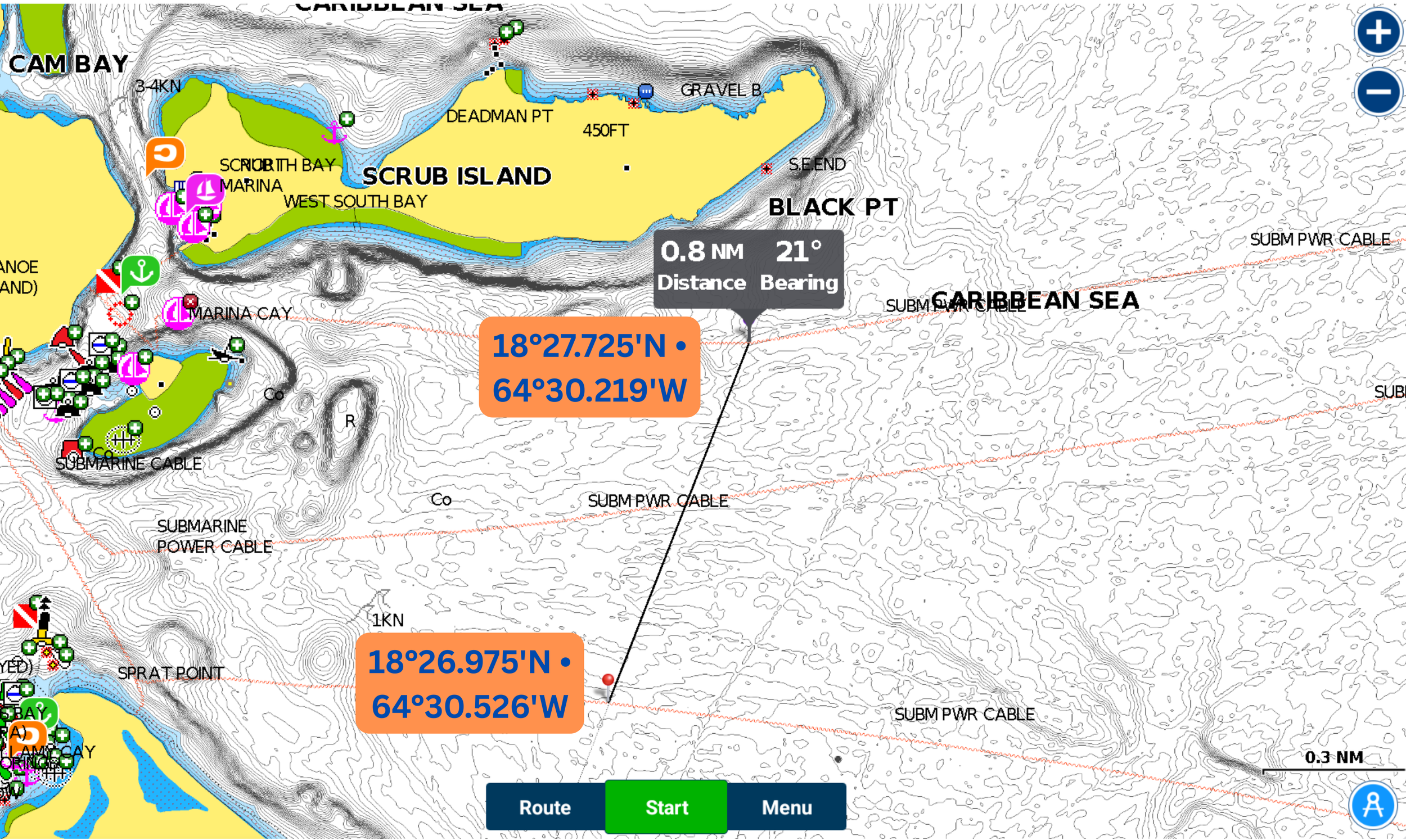 Finish line is as shown below, beginning at waypoint, 18°26.975'N • 64°30.526'W, and following a line due Northeast at 21° to 18°27.725'N • 64°30.219'W for 0.8NM. Note that the Finish Line tracks along a navigation line included as part of the chart, and both ends intersect with separate submarine cables, also included on the chart.