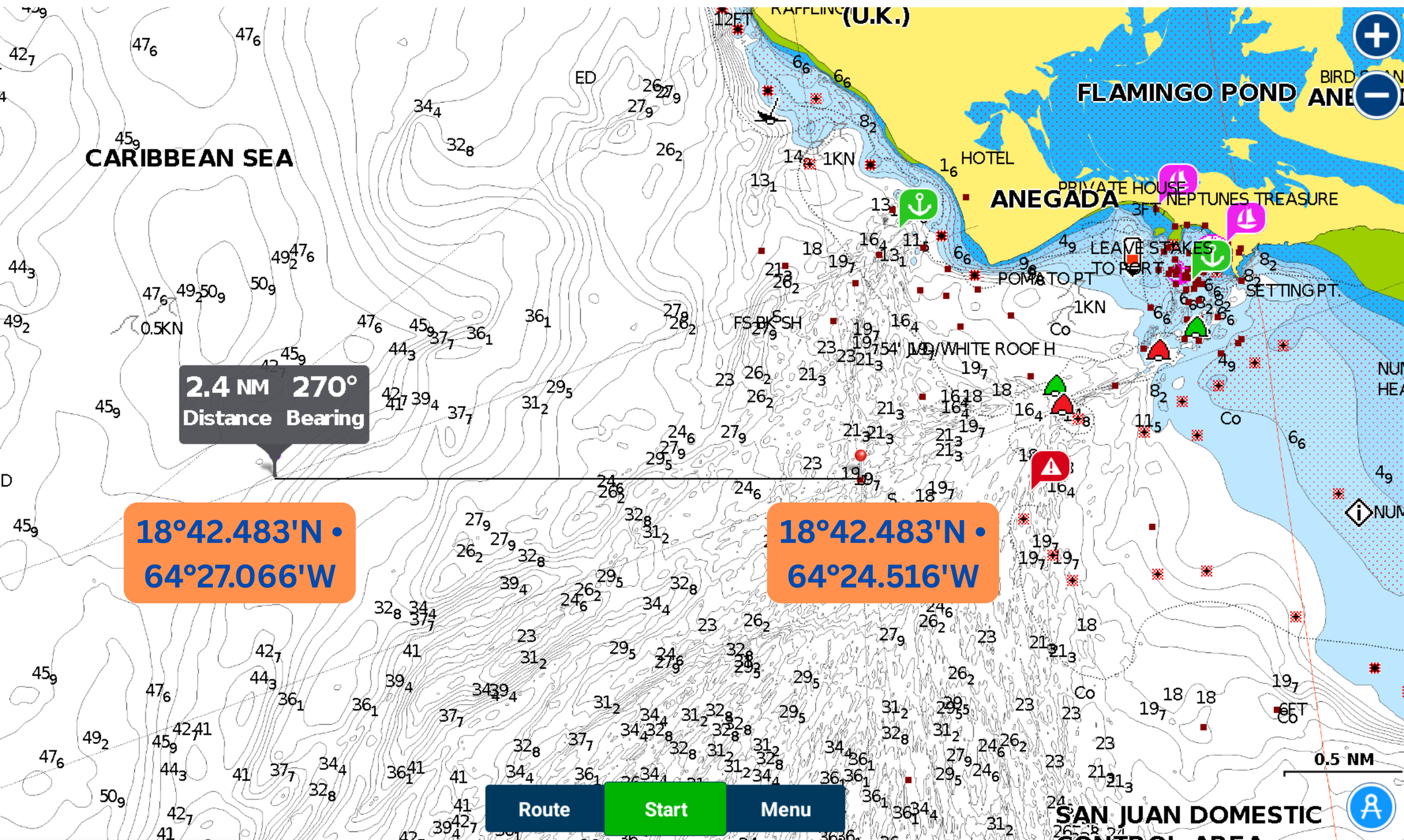 Start line is as shown below, beginning at the Anegada channel waypoint, 18°42.483'N • 64°24.516'W, and following a line due west at 270° to 18°42.483'N • 64°27.066'W for 2.4NM. Note the west end of the Start line will intersect with a navigation line included as part of the chart.