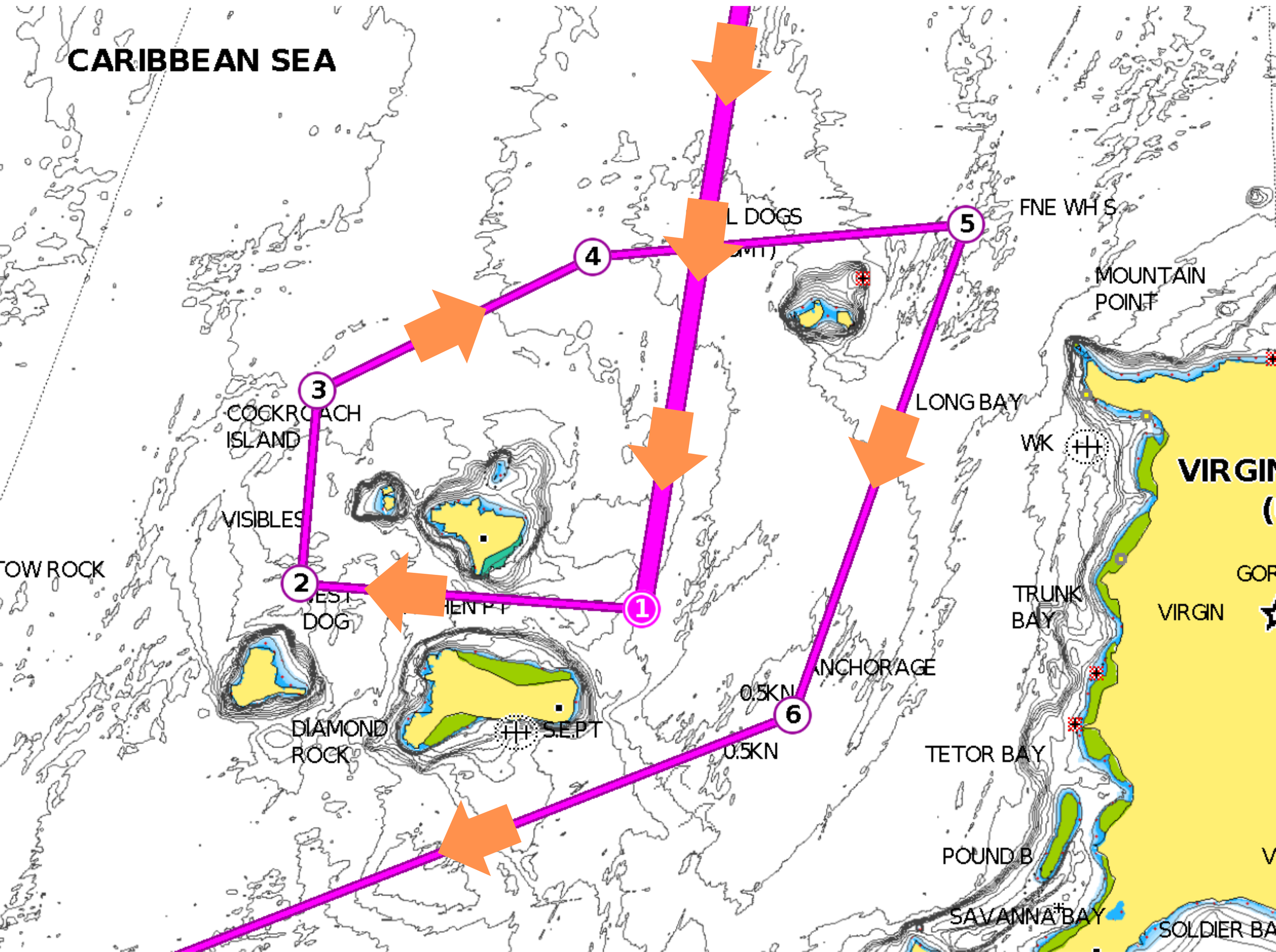 All yachts must follow the numbered route through and around The Dogs, as shown below.